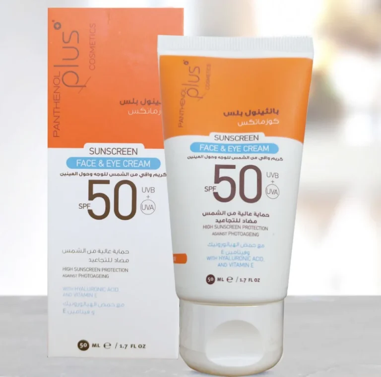 بانثينول بلس كوزماتيكس كريم واقي شمس للوجه وحول العينين 50 مل PANTHENOL PLUS COSMETICS SUN SCREEN FACE AND EYE CREAM كريم واقي شمس للوجه والعينين حماية عالية من اشعة الشمس SPF50 لجميع انواع البشرة, مضاد للتجاعيد والجذور الحرة .كريم يومي للوجه وحول العينين يقدم حماية عالية من التجاعيد المبكرة للجلد التي تسببها الشمس, مع عامل حماية SPF50 العالي فإنه يحمي بشكل فعال من الاشعة فوق البنفسجية UVA/UVB الضارة .