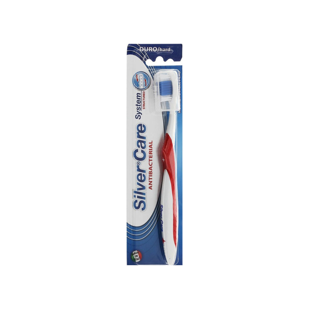 فرشاة أسنان متوسطة الحجم من سيلفر كير. الرأس مطلي بالفضة 999 ، مما يوفر تنشيط أيونات الفضة وعملية طبيعية مضادة للبكتيريا أثناء تنظيف الأسنان بالفرشاة عند ملامستها للماء ، مما يقضي بشكل فعال على مجموعة واسعة من الفيروسات والبكتيريا ، دون الإخلال بالنباتات الدقيقة في تجويف الفم ، وبالتالي منع تطور تسوس والتهابات اللثة ويوفر شعيرات تطهير ذاتي بعد تنظيف أسنانك بالفرشاة.